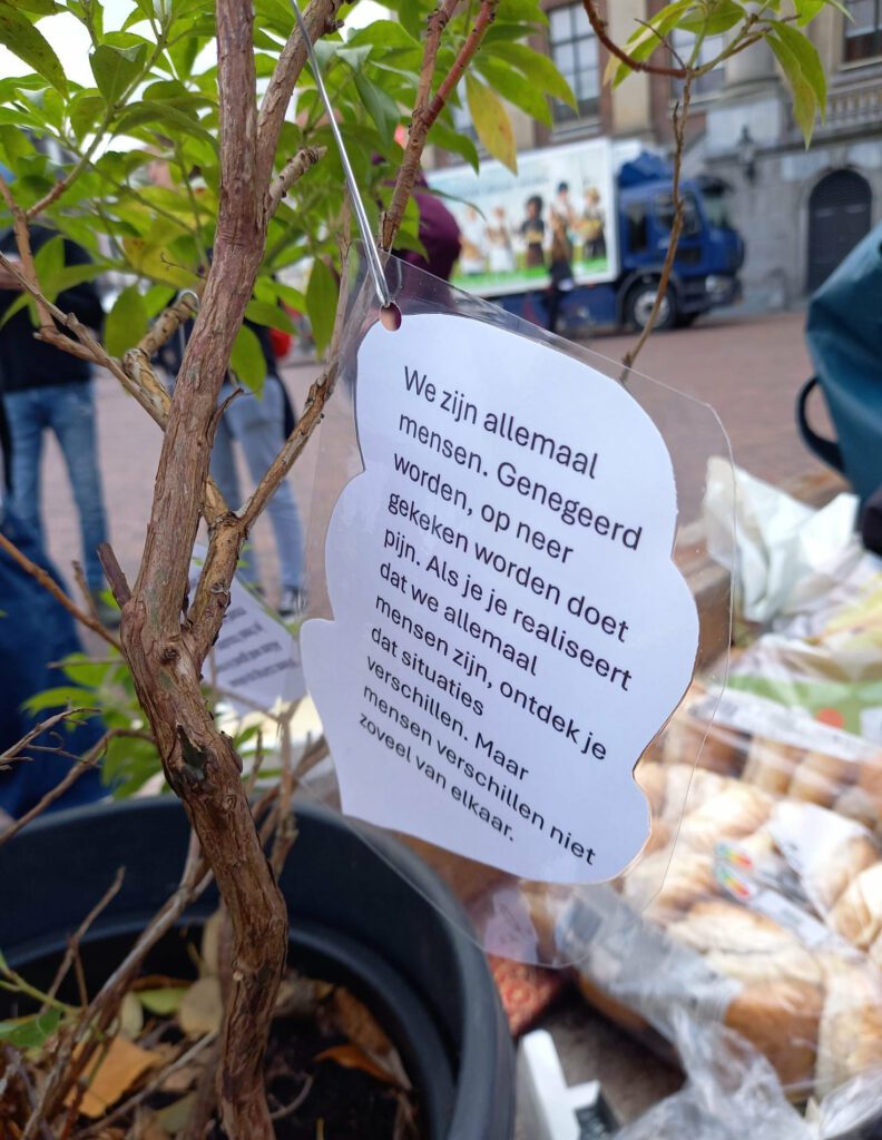 ‘Ja, 10 oktober was het wereld-dakloze-mensendag. Vanuit de vrijwilligersgroep kwam een superleuk idee. We liepen met een boom op een bakfiets door de stad en aan de boom hingen blaadjes met daarop uitspraken, levenswijsheden van dak- en thuisloze mensen. Bijvoorbeeld: ‘Praat niet over mij maar met mij’ of ‘Oordeel niet over mij, maar stel mij een vraag’ of ‘Laten we dichtbij durven zijn, want het geluk ligt op straat, kijk er niet overheen, het geluk zit in de ontmoeting’. Het leverde op straat heel veel gesprekken op. Er was ook een boekje waarin mensen iets terug konden schrijven. En het mooie is: er zal bij de Nieuwe Kerk een boom worden geplant op de plek waar een boom is omgewaaid. Die boom krijgt de kans om te gaan wortelen op die plek. Een boom die staat voor de mensen voor wie het niet zomaar vanzelfsprekend is dat zij geworteld zullen raken.’ Kerkbezoekers zullen dan langs de boom lopen die symbool staat voor de dakloze mensen en hun verhalen.